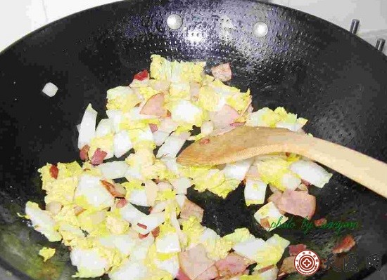 3.色拉油、淡炼乳高火2分钟后放入洋葱,高火2分钟,再放入面粉、炼乳、两大匙水与白菜汤汁拌匀,最后放入 白菜与肉片,高火5分钟即可。