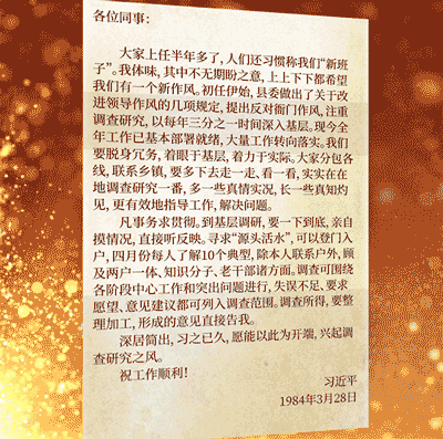 这是习近平担任县委书记后不久,写给正定四大机关的一封“共勉信”,号召大家“着眼于基层,着眼于实际”,兴起调查研究的新作风。