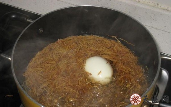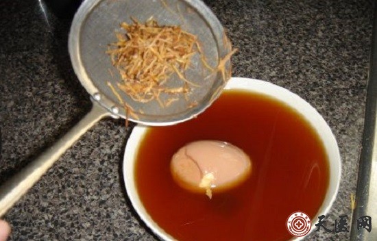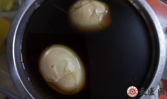 3、15分钟后捞起带壳鸡蛋,去壳,随后再将鸡蛋放回药煲内。