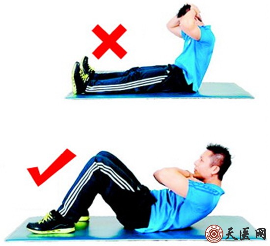 第二,很多人做仰卧起坐时,使劲抬起上身,用双肘接触膝盖,但不注意膝盖弯曲的角度,很多时候成了大腿根部肌肉在工作,而不是腹肌用力,这容易导致腰肌劳损,甚至压迫颈部神经。