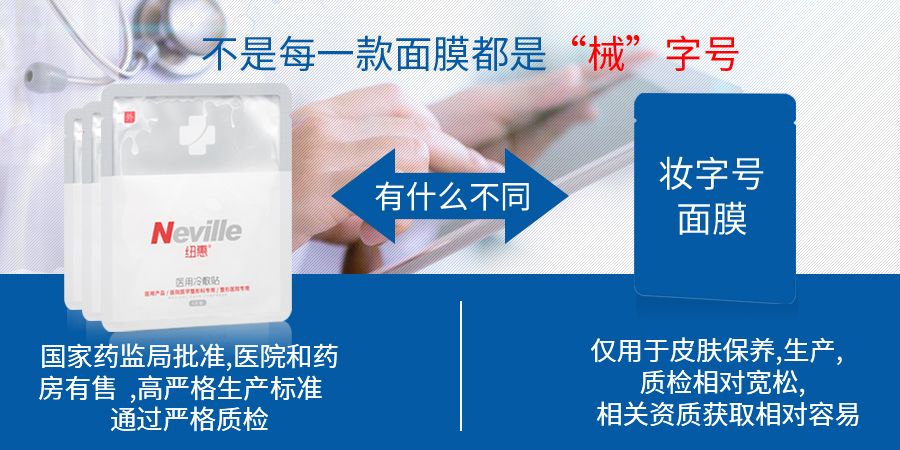 首先,医用面膜属于医学护肤品属于药监械(准)字号化妆品,就是通常所说的械字号,与消字号或者妆字号的护肤品不同的是它是有治疗作用,且必须在高严格标准下生产,通过严格质检在国家药监局批准的医院和药房销售的产品。