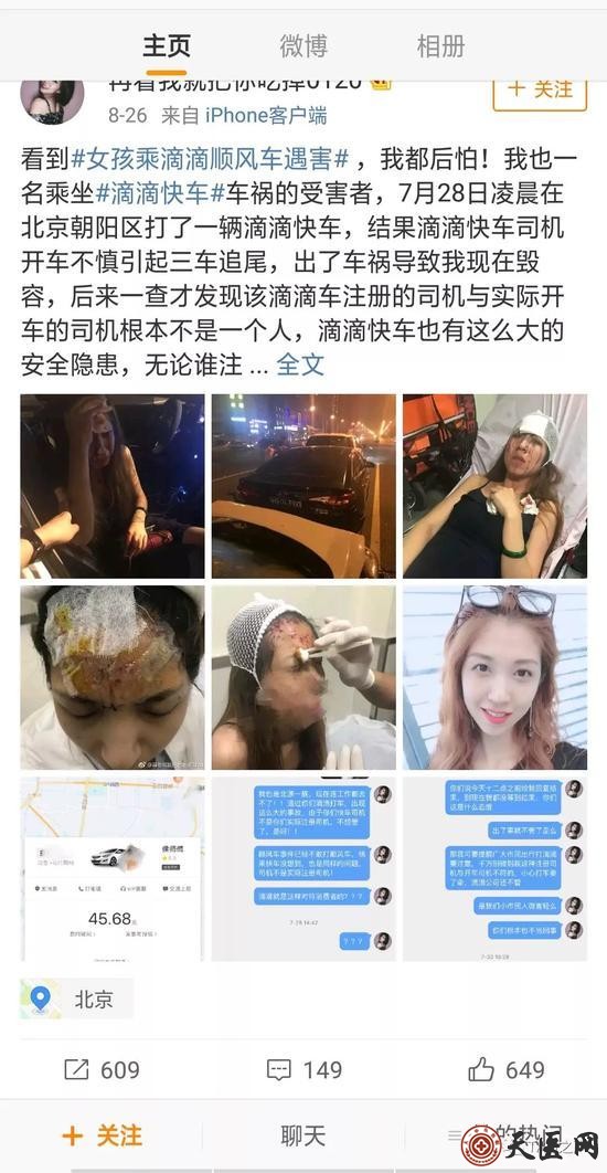 7月28日凌晨12时,晓榕在北京市乘坐一辆滴滴快车,行至平乐园地铁站附近,滴滴快车与前方两辆车发生追尾,女生头部撞击前挡风玻璃受伤,额头有多处创口,满脸是血。