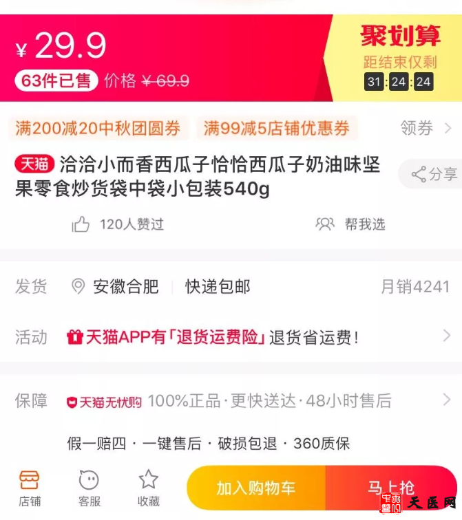 二氧化硫,如果过量、超标使用,长期食用会造成肠道功能紊乱、肝脏损伤,危害人体消化系统。天医网的小编在电商平台上搜索“小而香西瓜子”,发现很多店铺都在售“洽洽”品牌的这款瓜子,且最高月销量达8000多笔。在洽洽食品官方旗舰店里,被抽查不合格的瓜子产品依然在正常销售,月销量在4000多笔。
