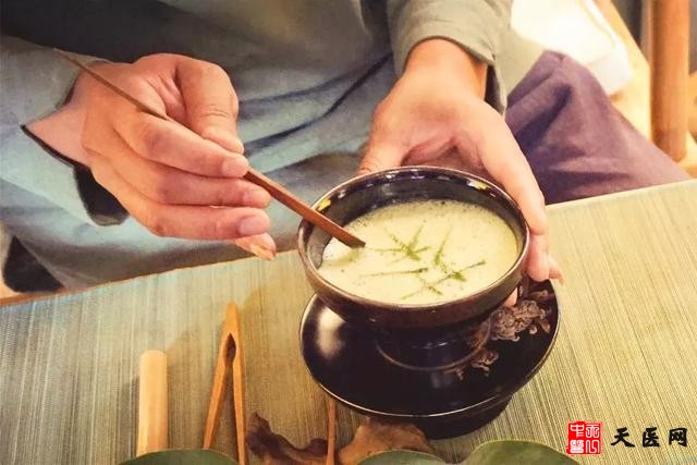 所谓调膏,就是视茶盏大小,用勺挑上一定量的茶末放入茶盏,再注入瓶中沸水,将茶末调成浓膏状,以粘稠为度。