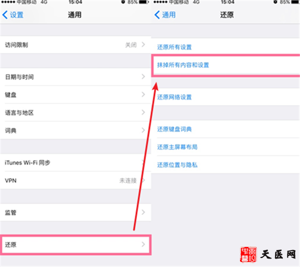 打开iPhone手机点击【设置】-【还原】-【抹掉所有内容和设置】,之后手机会重启。