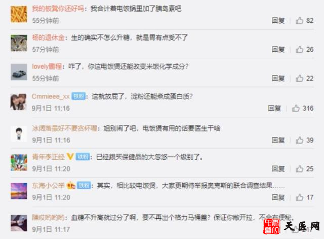 随即,这一言论引发网友热议。有网友评论:“血糖高还跟电饭煲有关系?”、有人指出“不管你再怎么烹饪,淀粉还是淀粉,它还是糖类”、甚至有网友表示“我觉得我的智商受到了侮辱……”、“开始向老人动手了,明显的**组织套路”。