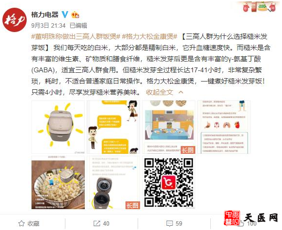 董明珠提到:“三高人群不敢吃饭,吃饭血糖就要升高。既然有这个需求,我们就要创造,所以我们做出了三高人群的饭煲。在座各位如果有血糖高的人,你就打开我的微信,到我的微店买三高人群的饭煲,保证你敞开吃,血糖不升高。”