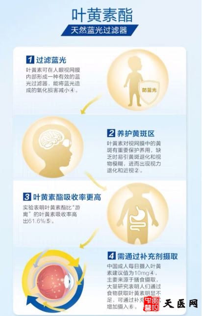 另一方面,叶黄素也能在眼睛视网膜中找到,附着在眼睛当中的叶黄素,能够抗氧化,能够吸收过滤对眼睛有刺激作用的蓝紫光线,紫外线和屏幕蓝光均包括在内,对眼睛很有帮助。但是也由于叶黄素具有较强的抗氧化作用,较容易反应消耗掉,需要注意补充叶黄素。